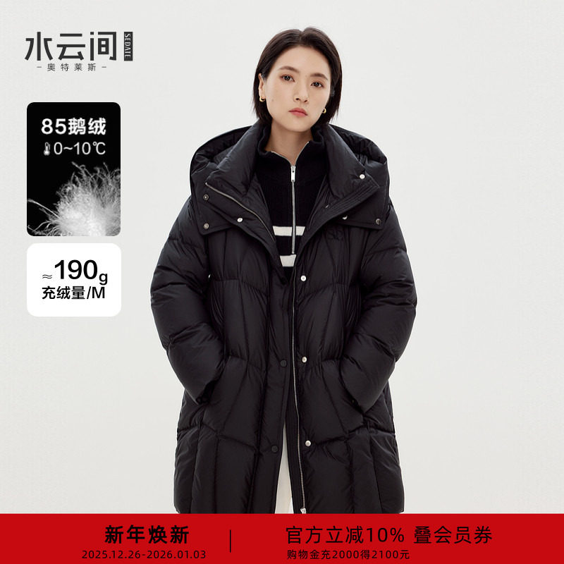 水云间黑色立领羽绒服厚女鹅绒连帽外套防风保暖中长款2025冬新款