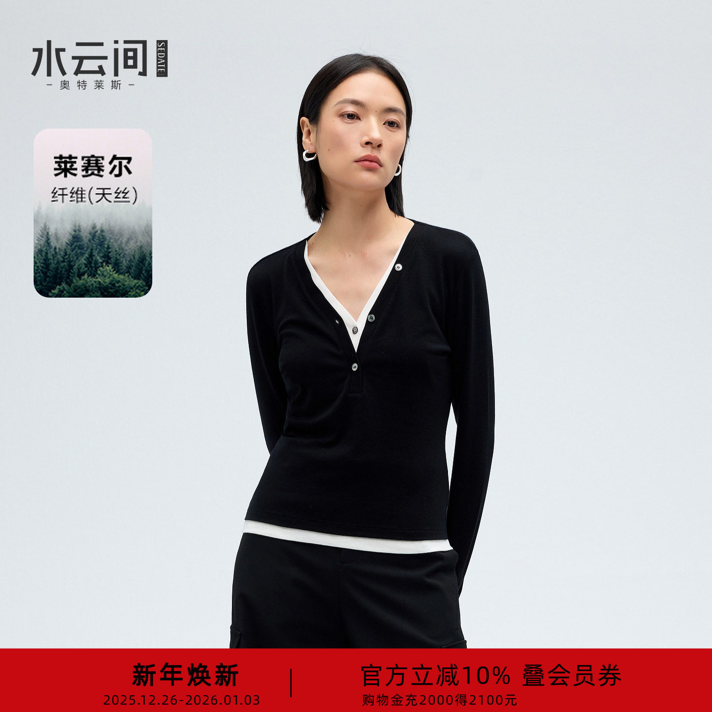 水云间V领假两件天丝针织衫女莱赛尔长袖内搭毛衣上衣2026春新款