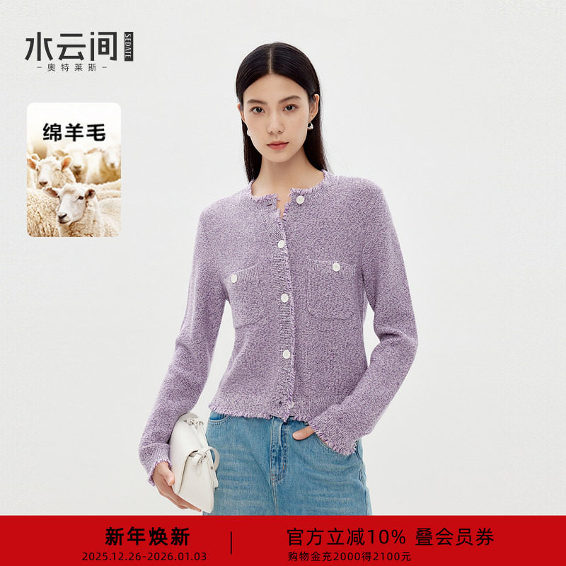 水云间紫色纯羊毛针织开衫外套女短款毛边长袖上衣叠穿2025秋新款