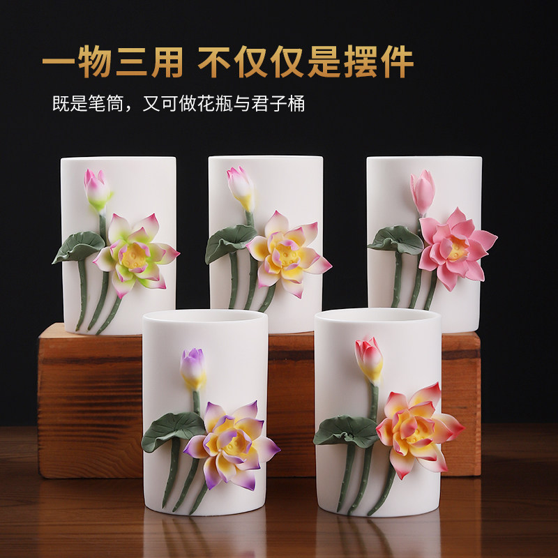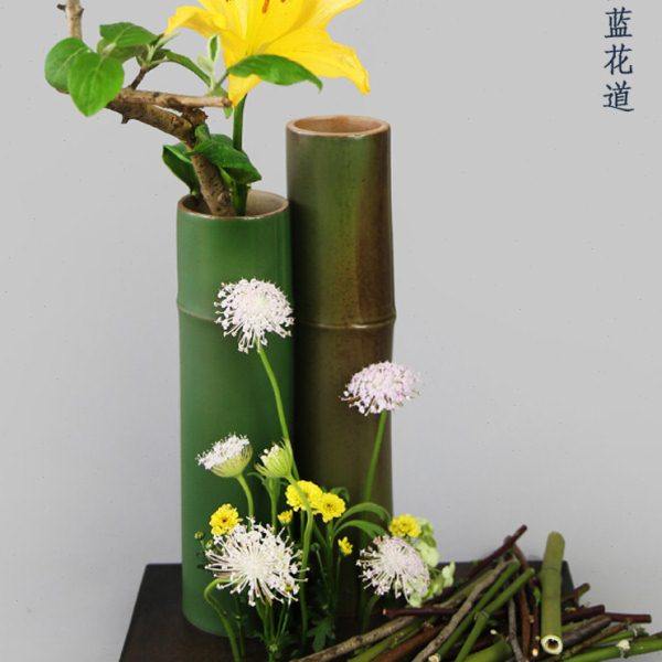 仿竹筒壁挂陶瓷插花花器禅意中式花瓶器皿中华花艺花道中国风摆件