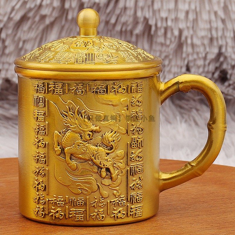 纯黄铜麒麟百福茶缸茶杯带盖带把老式茶缸子新中式餐厅中国风摆件