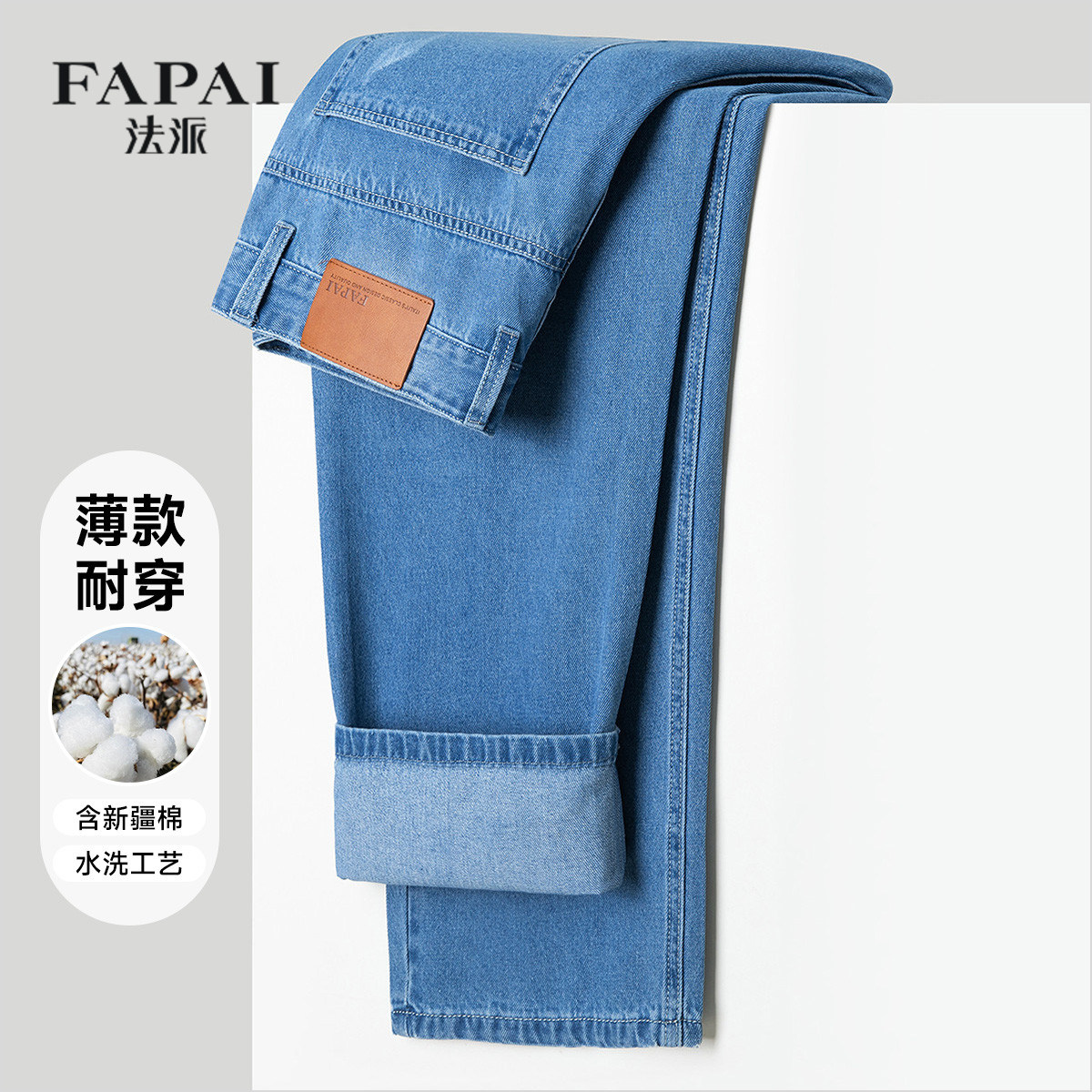 法派男士休闲牛仔裤夏季薄款浅色水洗直筒百搭修身破洞男式长裤子
