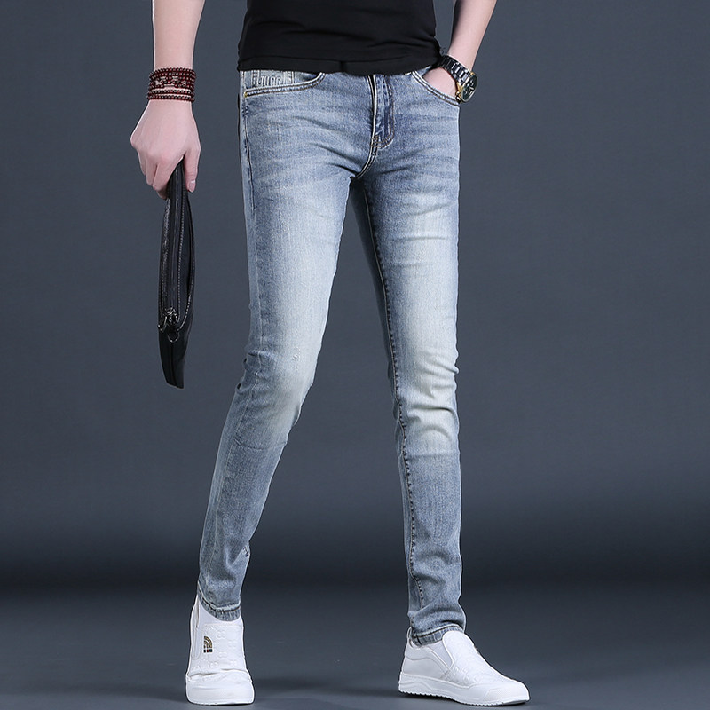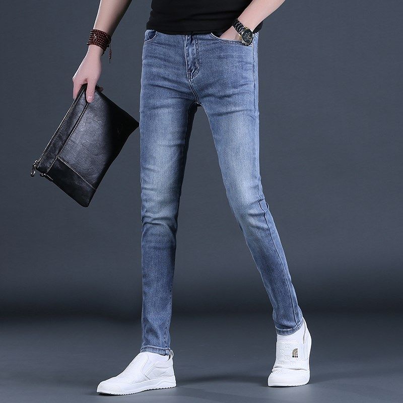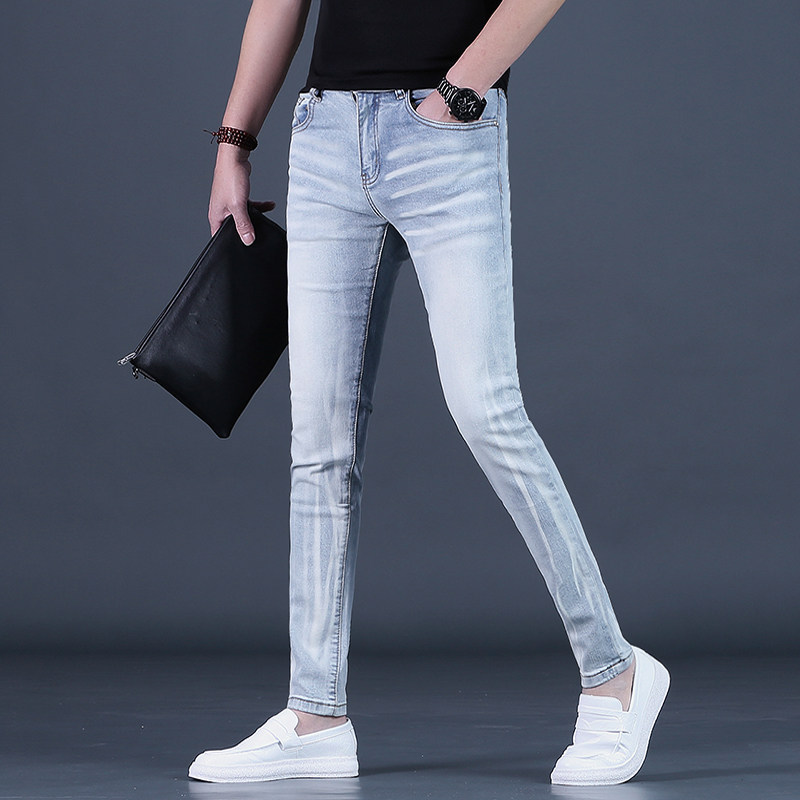 2023新款裤子男士牛仔裤薄潮流修身小脚弹力浅蓝色春夏男式休闲裤