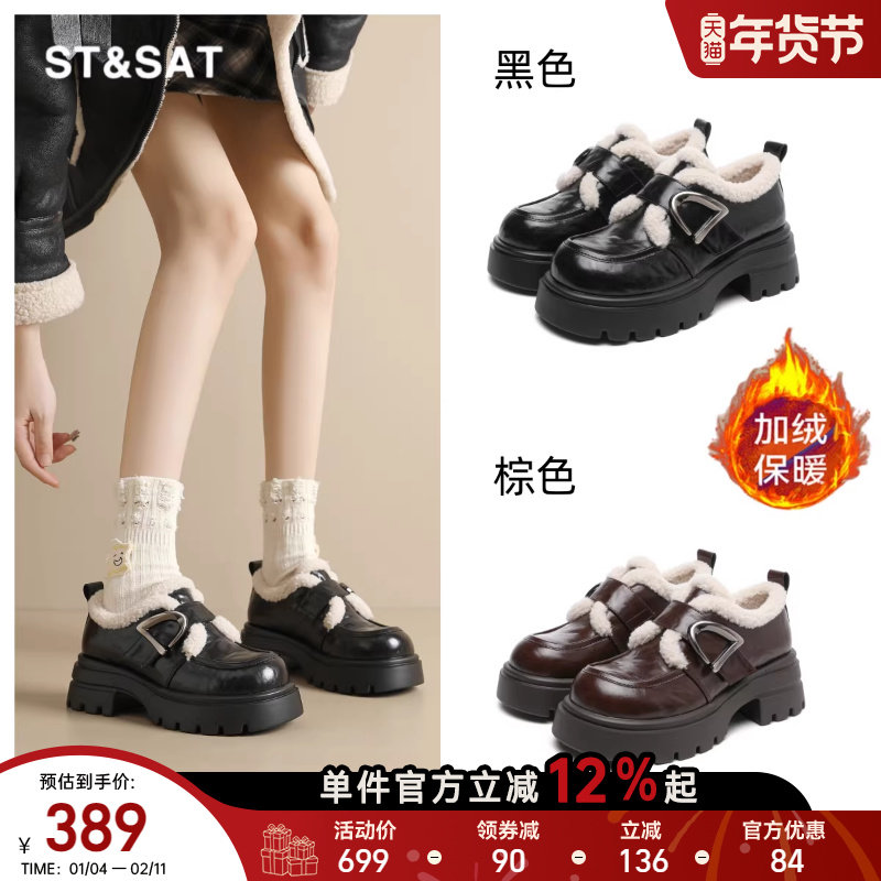 三卷sanjuan加绒小皮鞋女冬毛毛鞋厚底乐福鞋英伦风单鞋保暖棉鞋