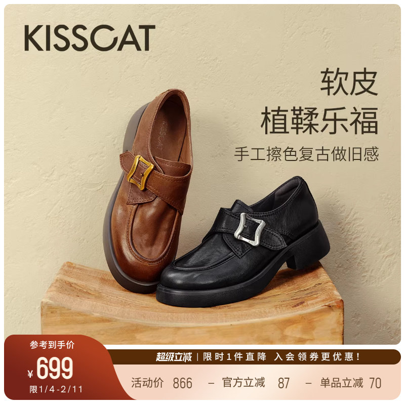 [心动的offer同款]接吻猫[银锭系列]厚底乐福鞋通勤黑色小皮鞋女