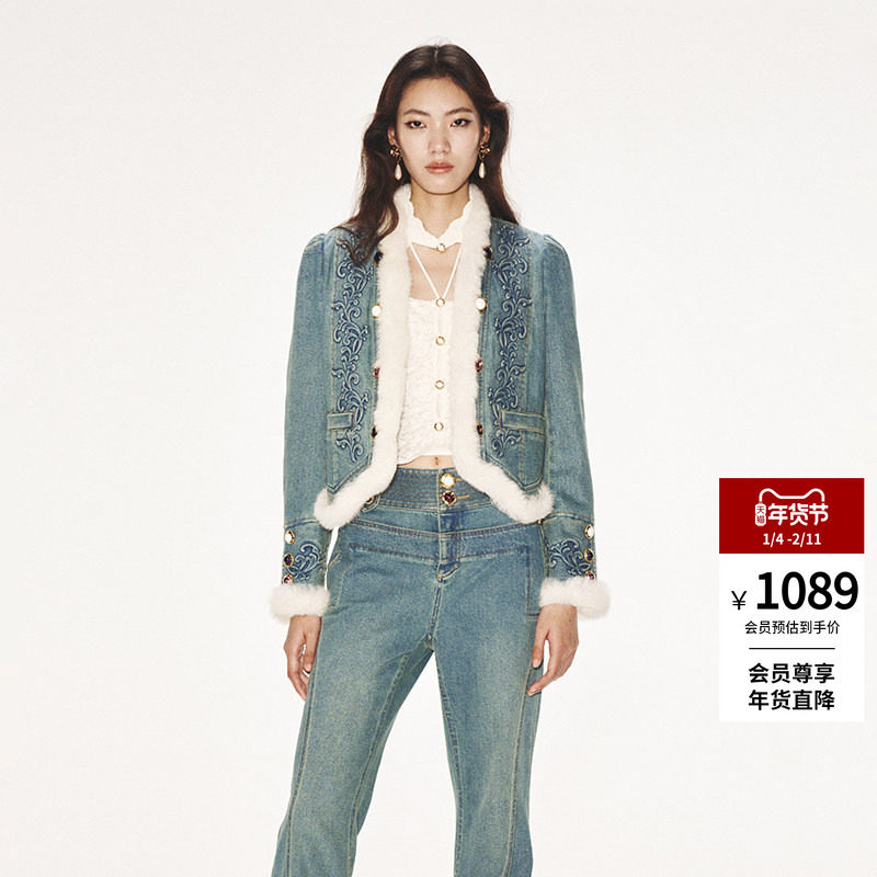 2025秋冬新款狐狸毛领兔毛内胆时髦小个子牛仔外套女短款上衣夹克