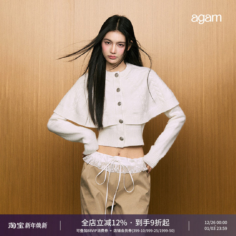 AGAM 开春斗篷披肩上衣女白色短款气质高级修身毛衣麻花针织开衫