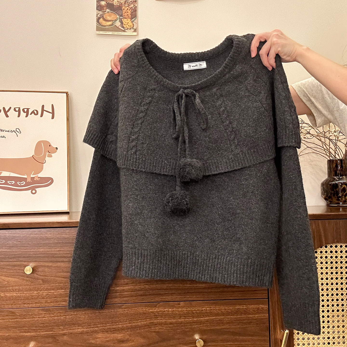 奶油的宇宙 绑带斗篷披肩假两件针织毛衣女韩系气质软糯短款上衣