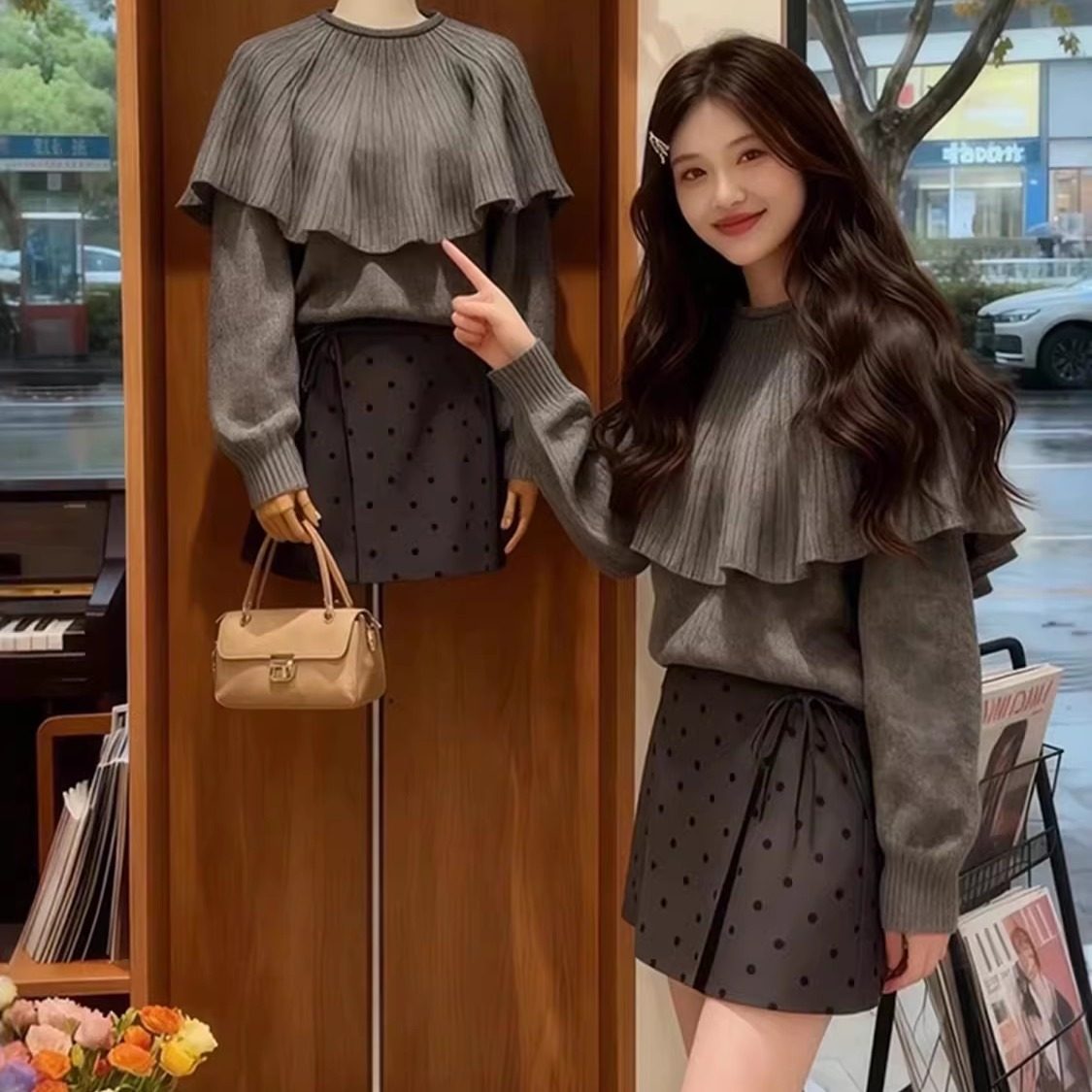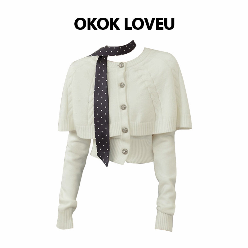法式小香风波点飘带斗篷披肩上衣针织衫女秋冬新款气质两件套毛衣