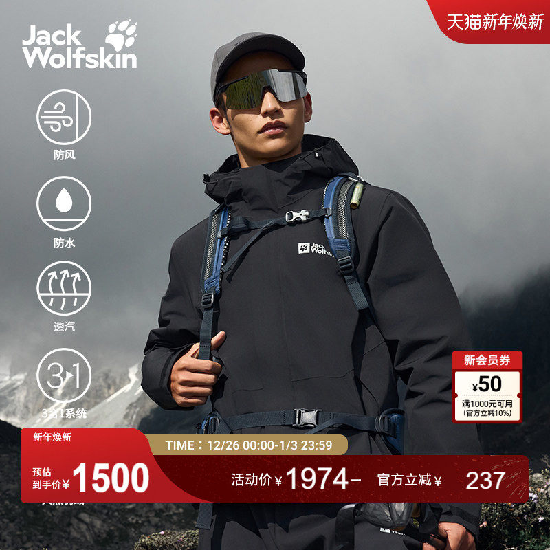 JackWolfskin狼爪25秋冬新款CRUSH'IN情侣三合一冲锋衣5012776