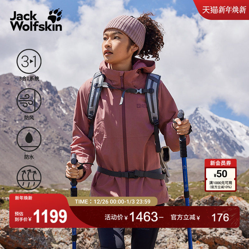 JackWolfskin狼爪25秋冬新款女士防风防水鹅绒三合一冲锋衣A66106