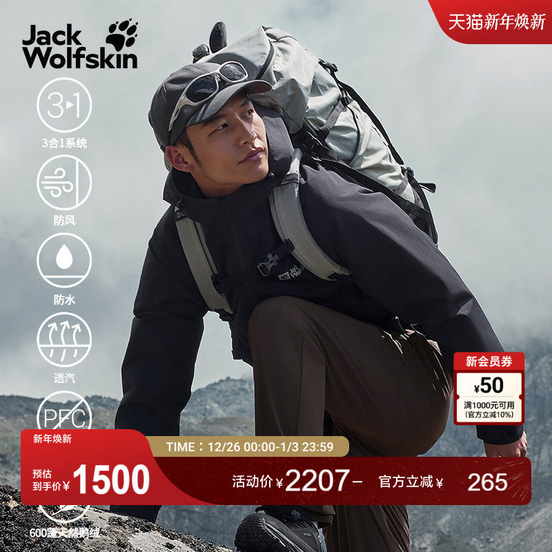 JackWolfskin狼爪新款COCTA男士户外羽绒三合一冲锋衣鹅绒5122091