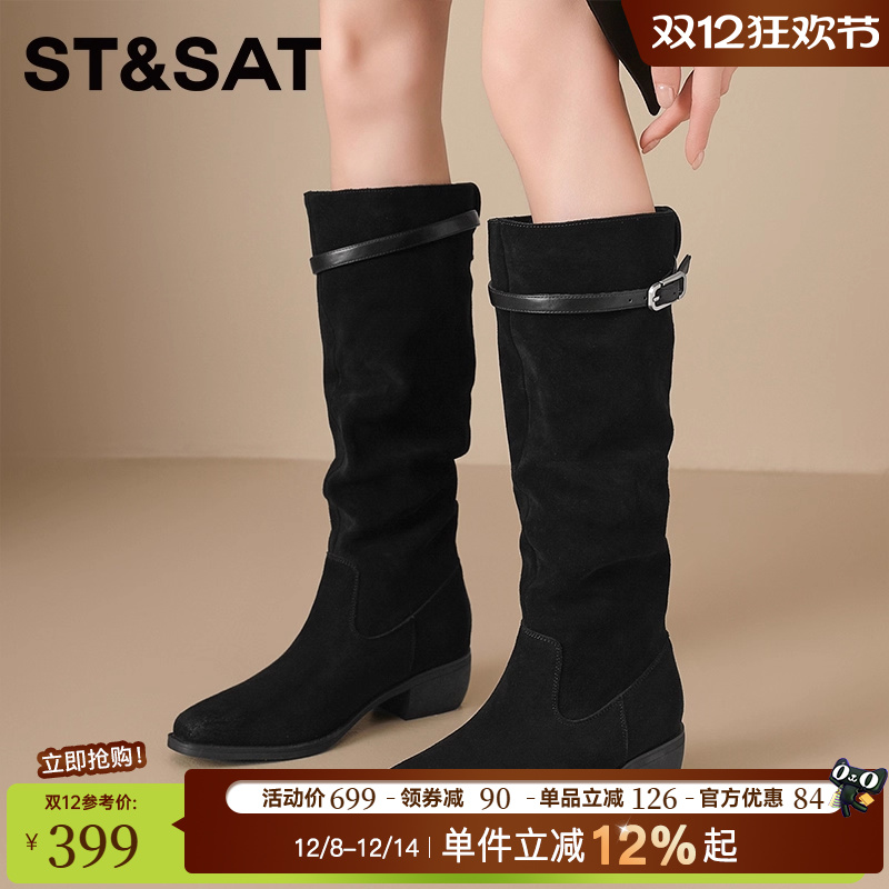 星期六长筒靴女2025新款秋冬加绒高筒靴粗跟长靴骑士靴中筒长靴子