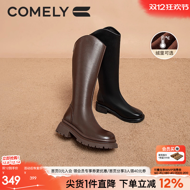 康莉加绒厚底骑士靴女冬季新款不过膝圆头高筒粗跟显瘦V口长靴子