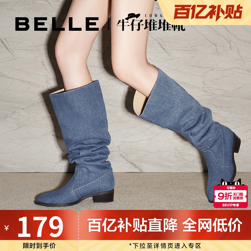 百丽女鞋堆堆靴过膝长靴子冬季新款高长靴户外西部牛仔靴BCYA9DC3