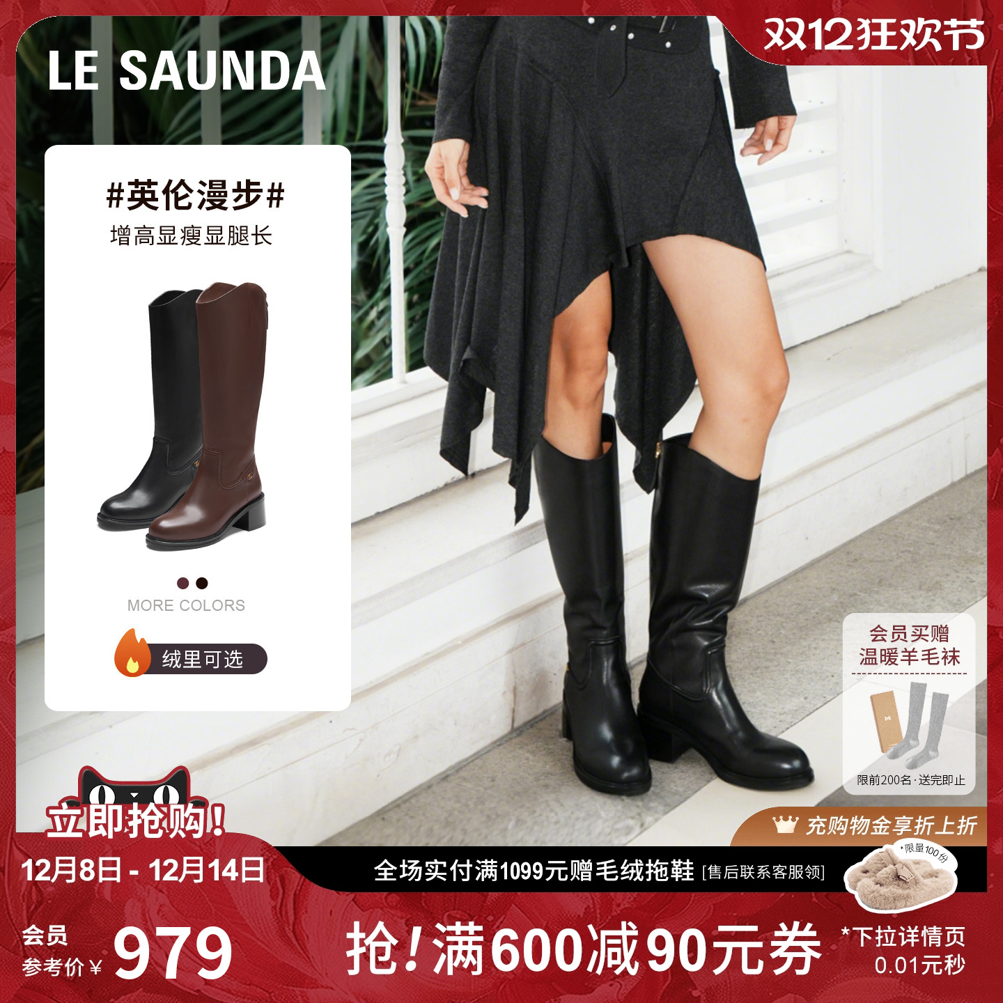 莱尔斯丹2025秋冬新款加绒黑色真皮复古骑士粗跟长靴子女鞋57302
