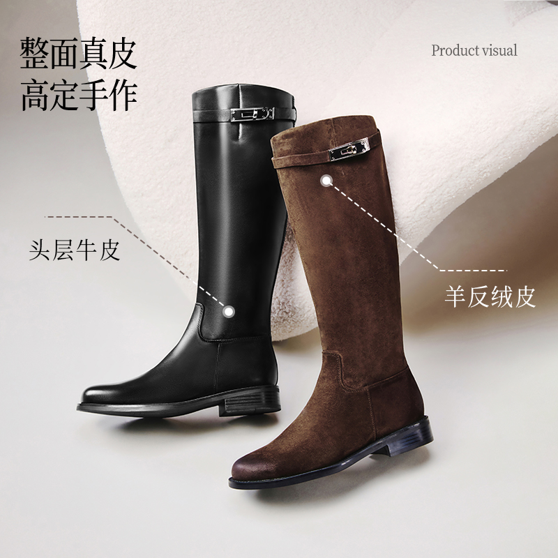 百丽高长骑士靴女2025冬季新款加绒真皮显瘦瘦长筒靴子3QFB8DG5