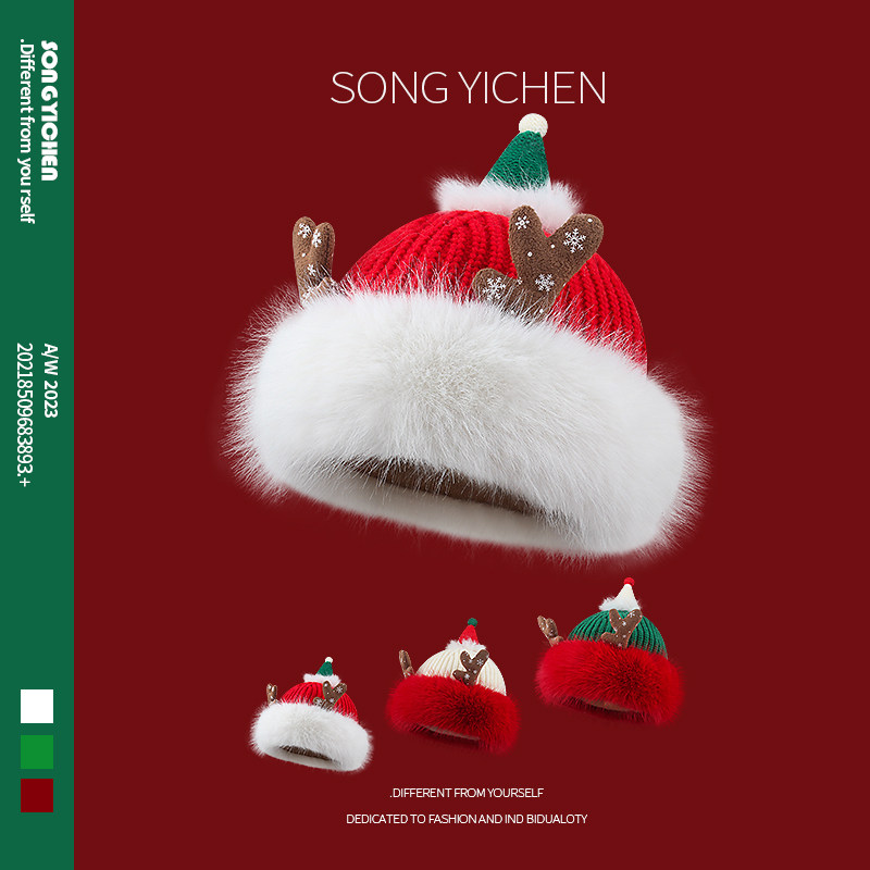 圣诞节红色帽子女韩国可爱麋鹿角毛绒针织帽冬季防寒保暖护耳帽潮