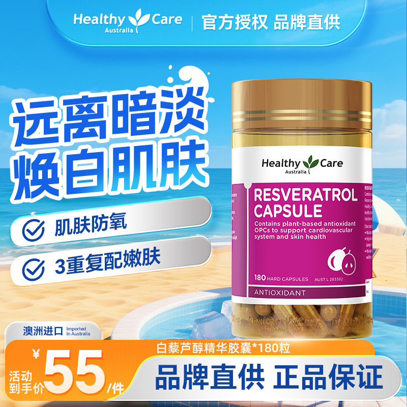 HealthyCare白藜芦醇软胶囊熬夜痘痘肌亮白嫩肤祛黄180粒澳洲进口