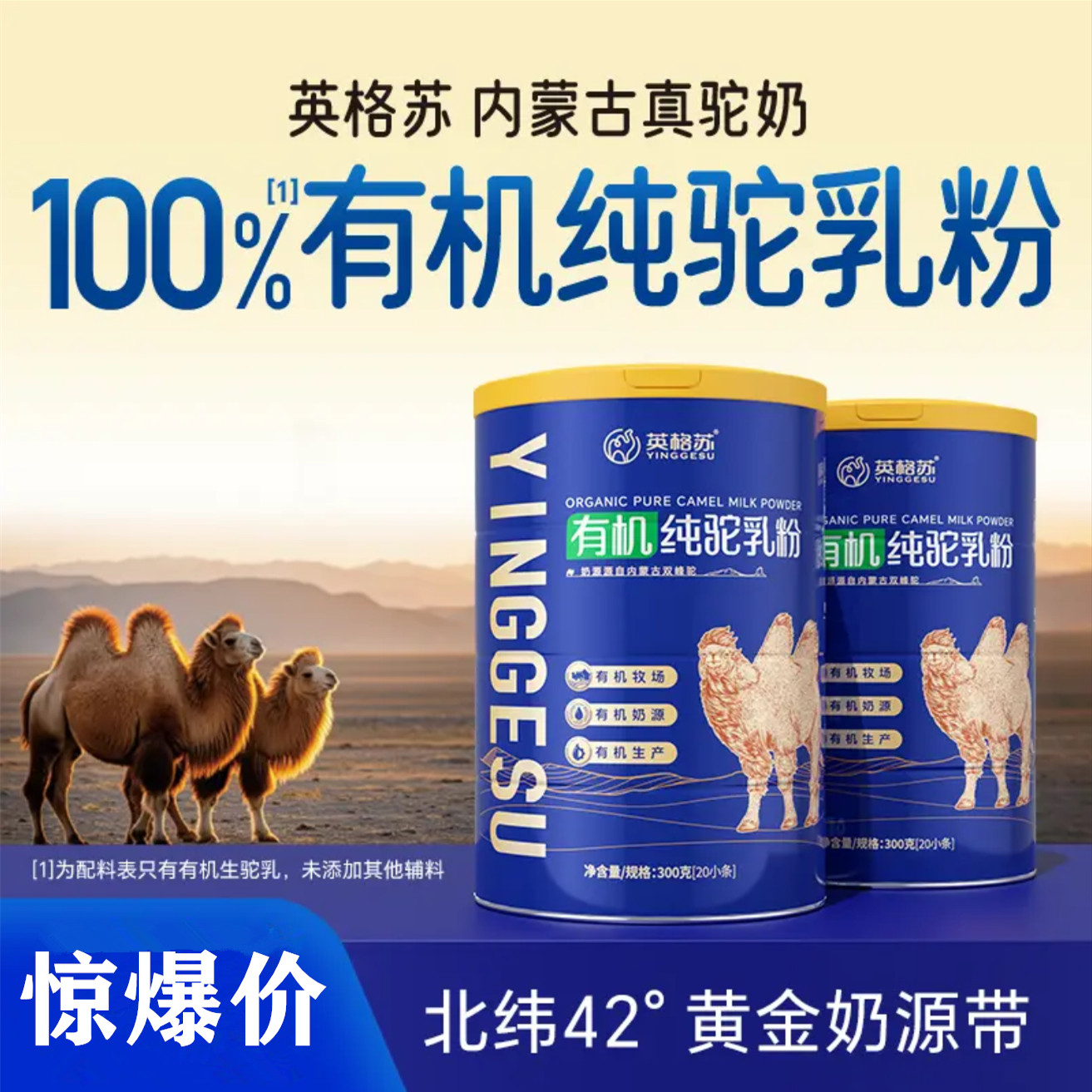 英格苏内蒙双有机纯骆驼奶粉 成人奶粉中老年高钙无蔗糖纯驼乳粉