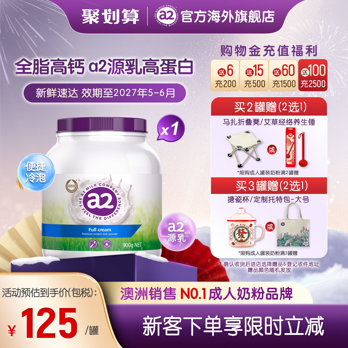 a2奶粉紫吨吨成人高钙高蛋白全脂奶粉青少年中老年人营养900g进口