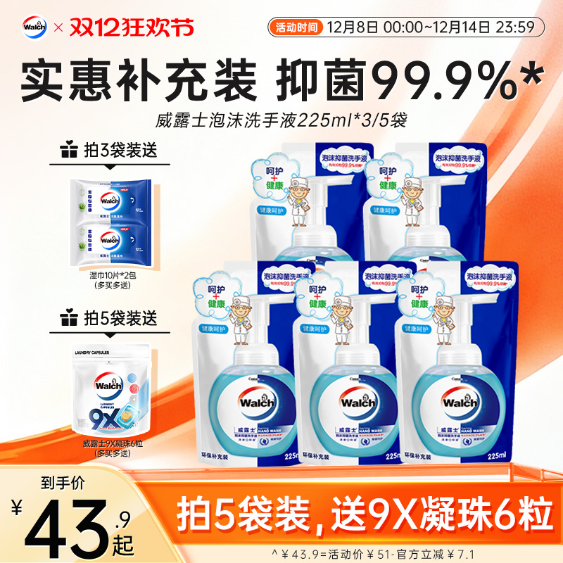 【抑菌99.9%】威露士泡沫洗手液225ml补充装儿童家用官方替换袋装