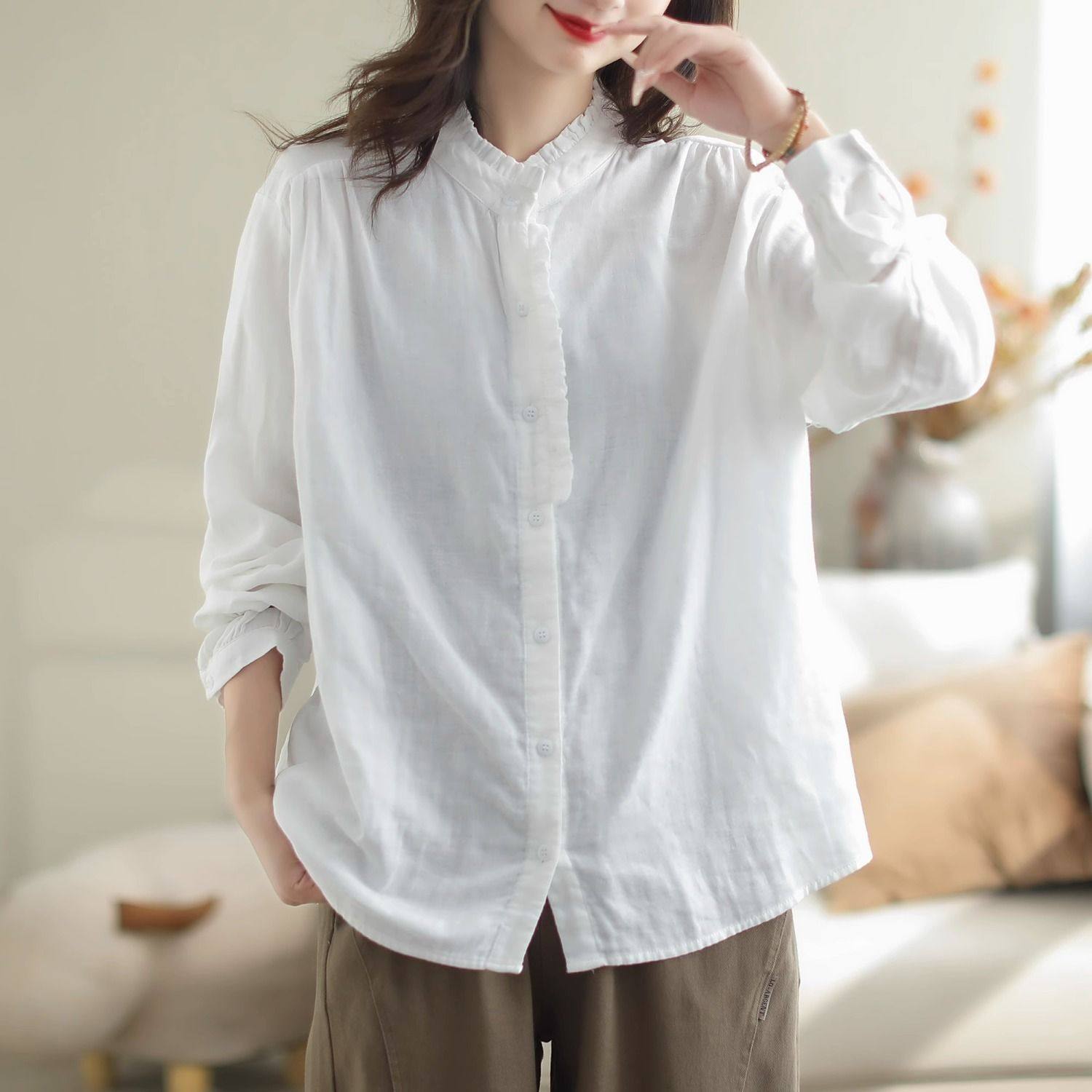 小方领衬衫女2025春夏新款纯棉文艺棉麻宽松吸汗衬衣长袖百搭外套