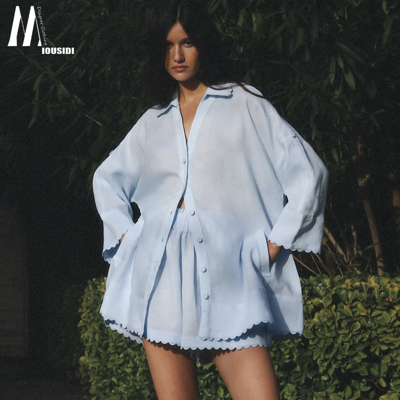 蓝色衬衫棉麻宽松春夏慵懒廓形度假长袖防晒衬衣女松紧腰短裤套装