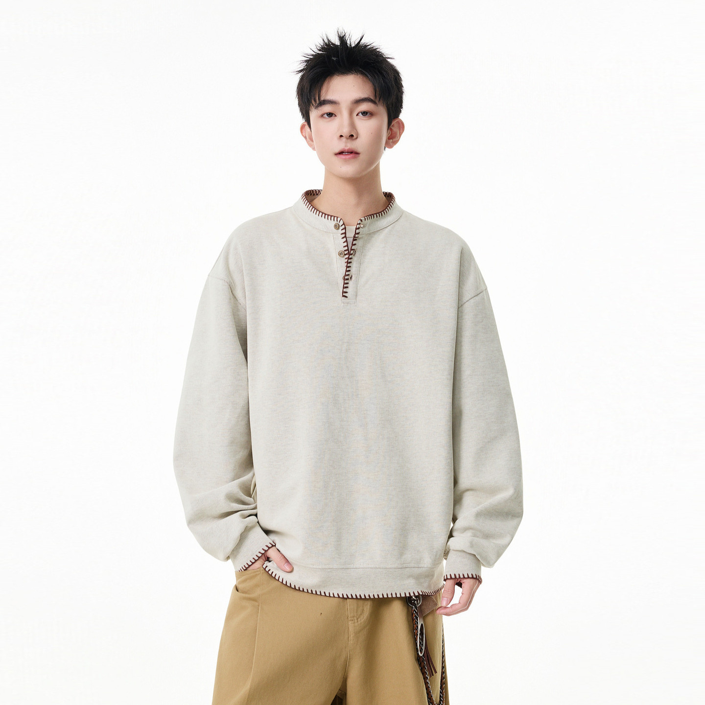 悟空有货复古手缝线亨利领卫衣男女2026春季潮牌情侣宽松百搭上衣