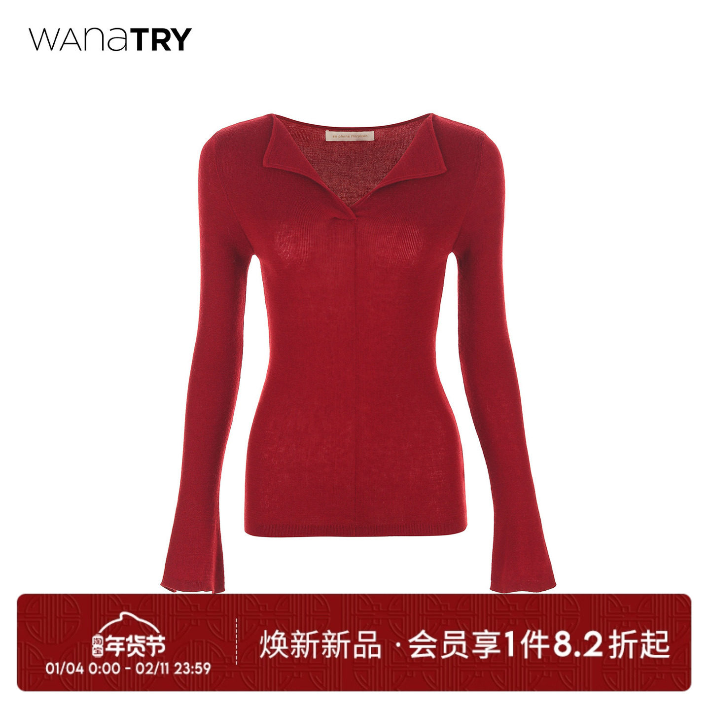 wana try绵羊毛翻领修身显瘦针织衫红色2025冬季新款喇叭袖上衣女