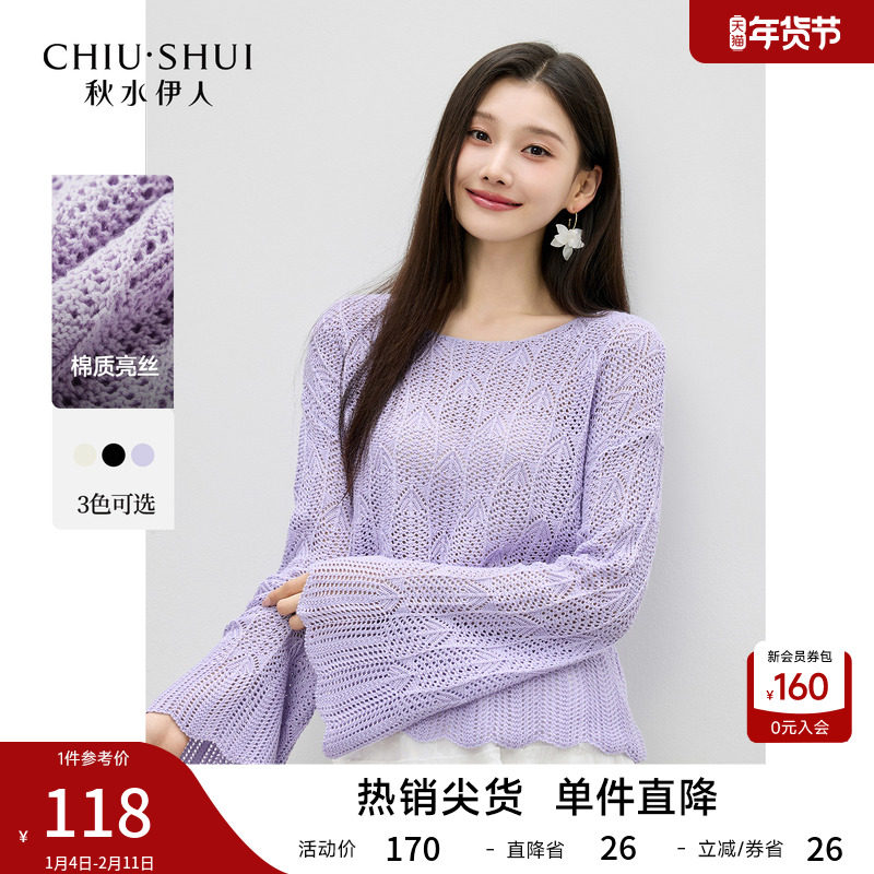 秋水伊人紫色针织衫女2026春季新款女装镂空喇叭袖上衣多巴胺毛衣