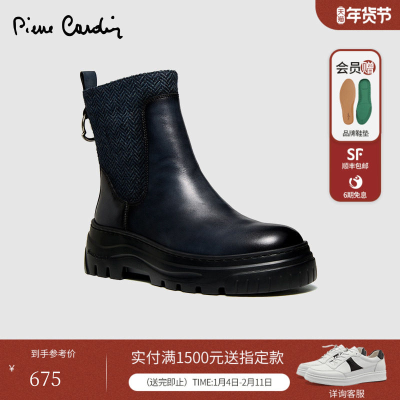 皮尔卡丹女鞋复古真皮拼接织物金属套脚短筒平跟显瘦侧拉链短靴女