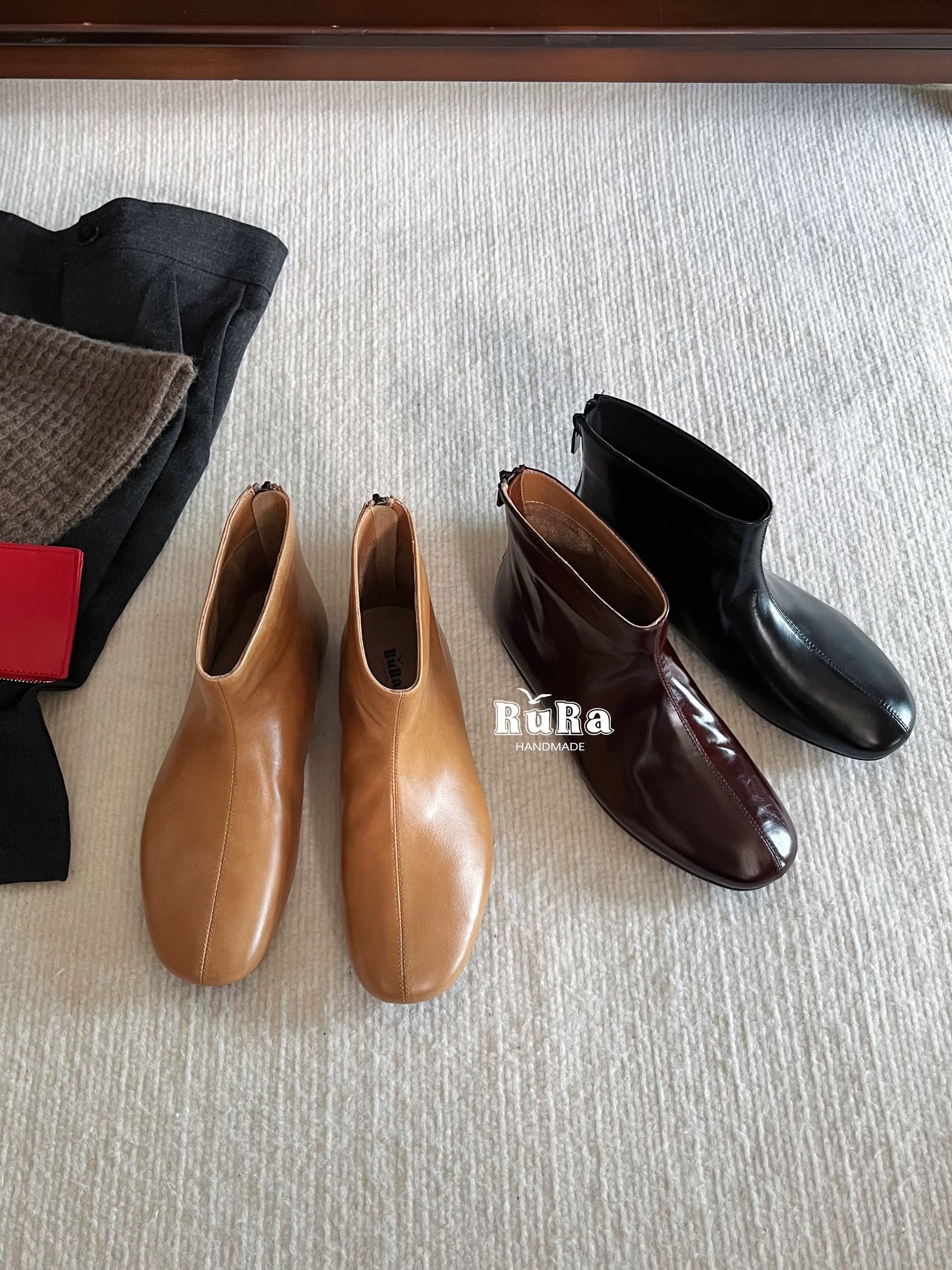rura法式圆头平跟短靴女2025年秋冬新款小踝靴马丁靴漆皮瘦瘦靴