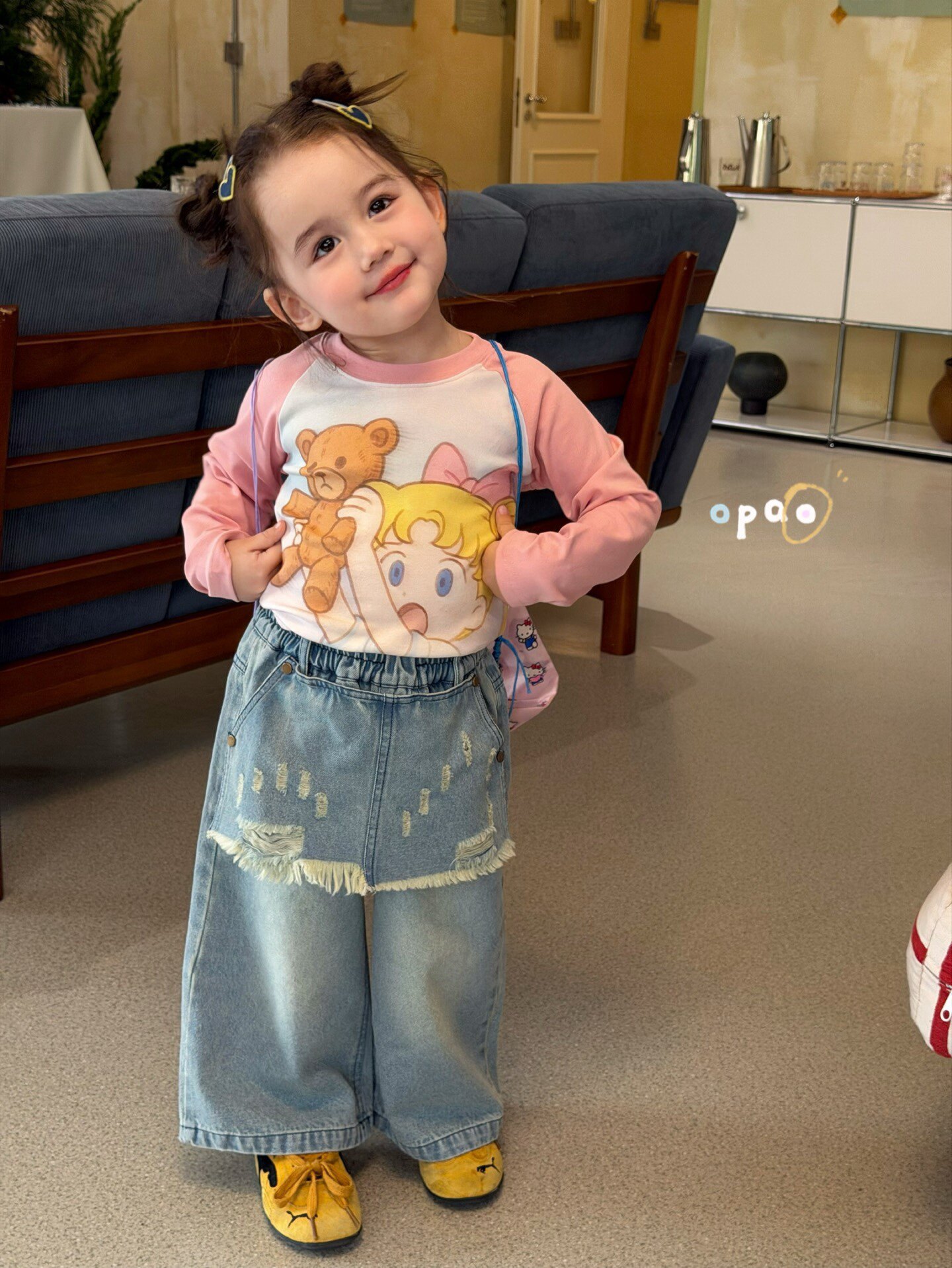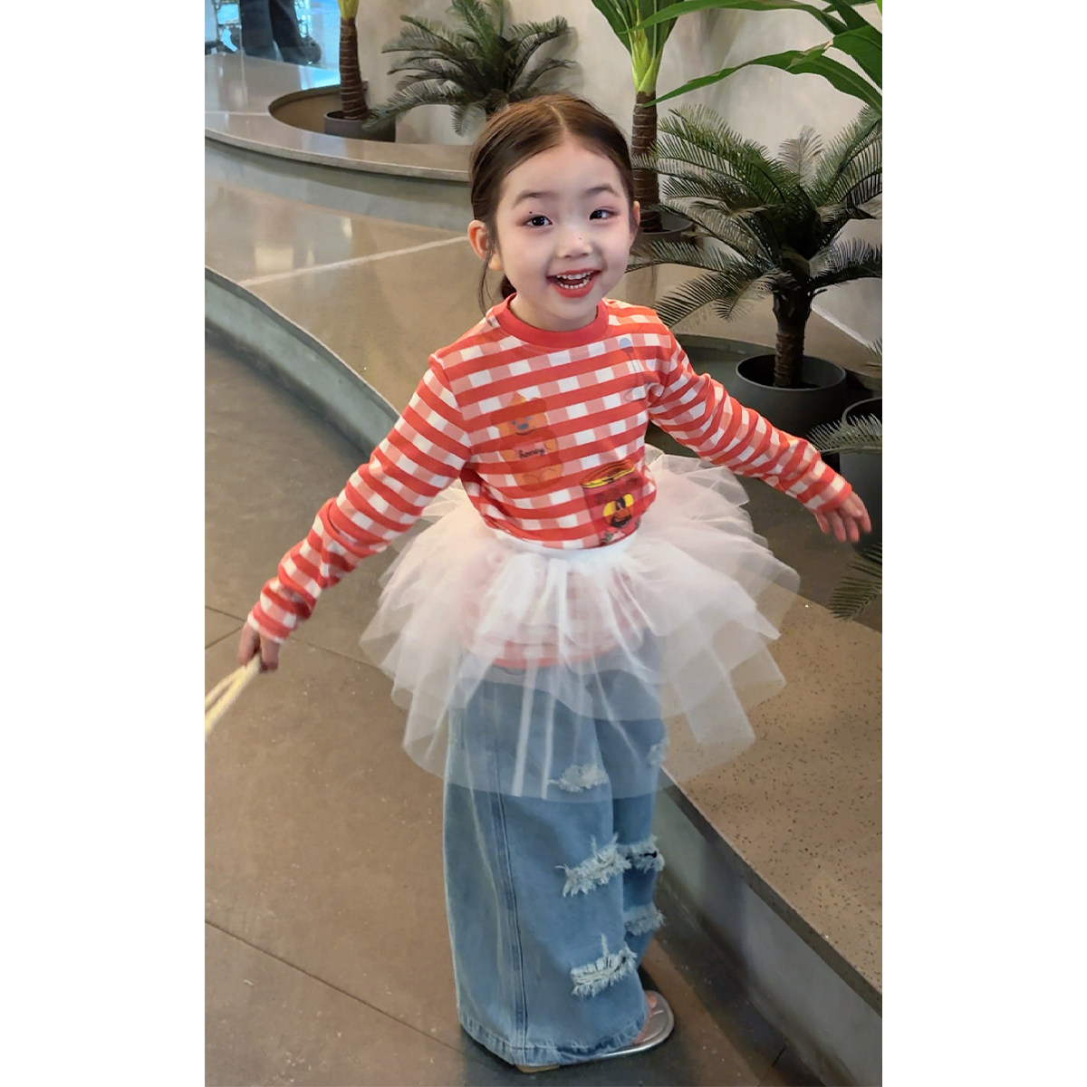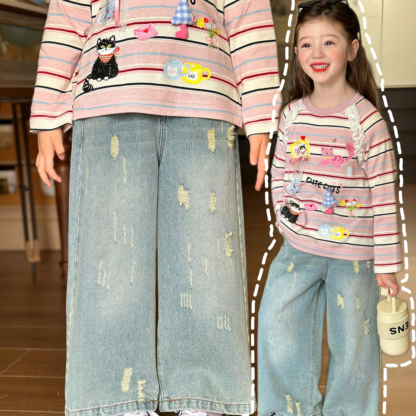 凡妈童装26春款女童小童韩版动漫卡通修身T恤做旧破洞直筒牛仔裤