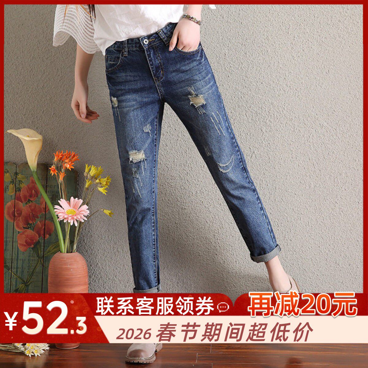- 破洞小脚宽松牛仔裤女