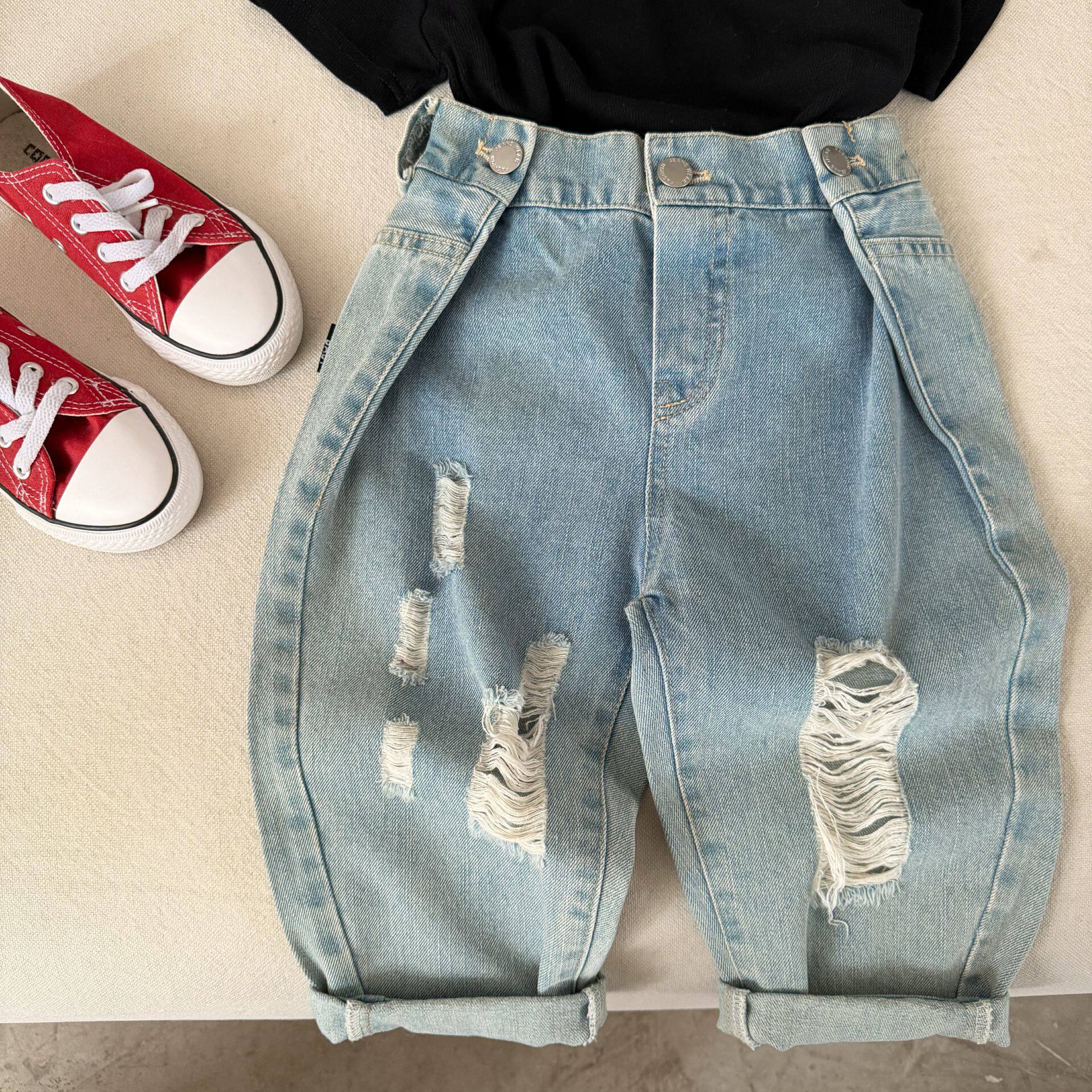 貌貌妈家2025春季新款韩版男女童复古美式高街破洞牛仔裤儿童长裤