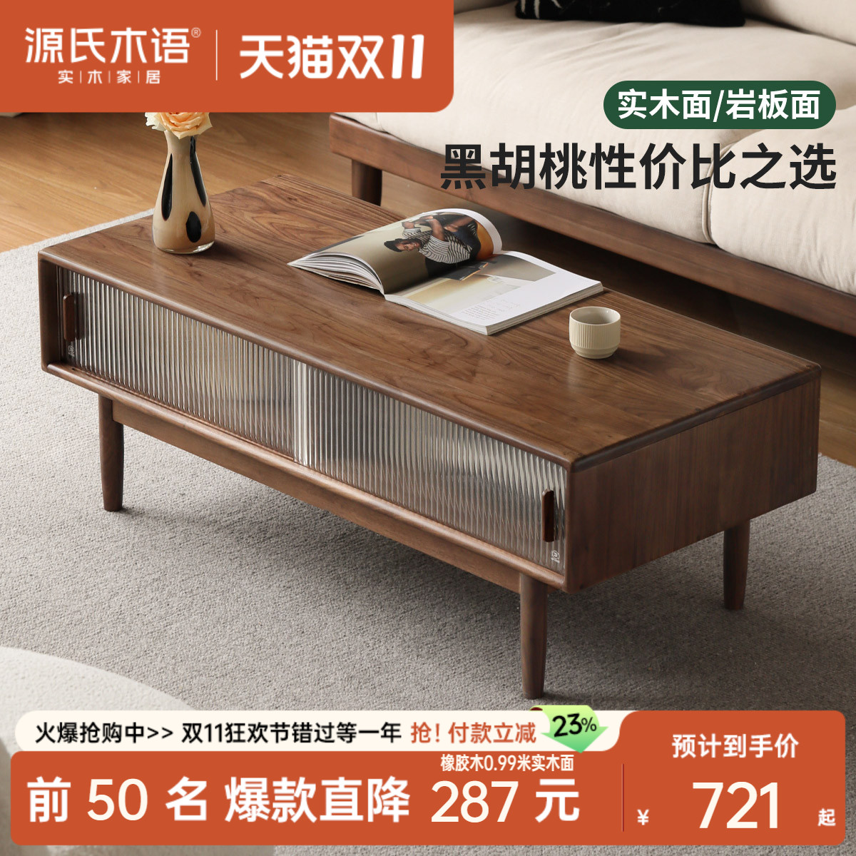 源氏木语全实木茶几现代简约客厅岩板茶桌小户型黑胡桃木储物茶台