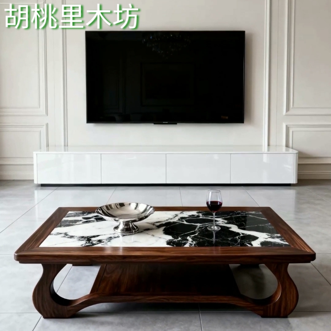 水墨兰亭黑胡桃木茶几实木长方形家用客厅岩板茶几电视柜组合轻奢