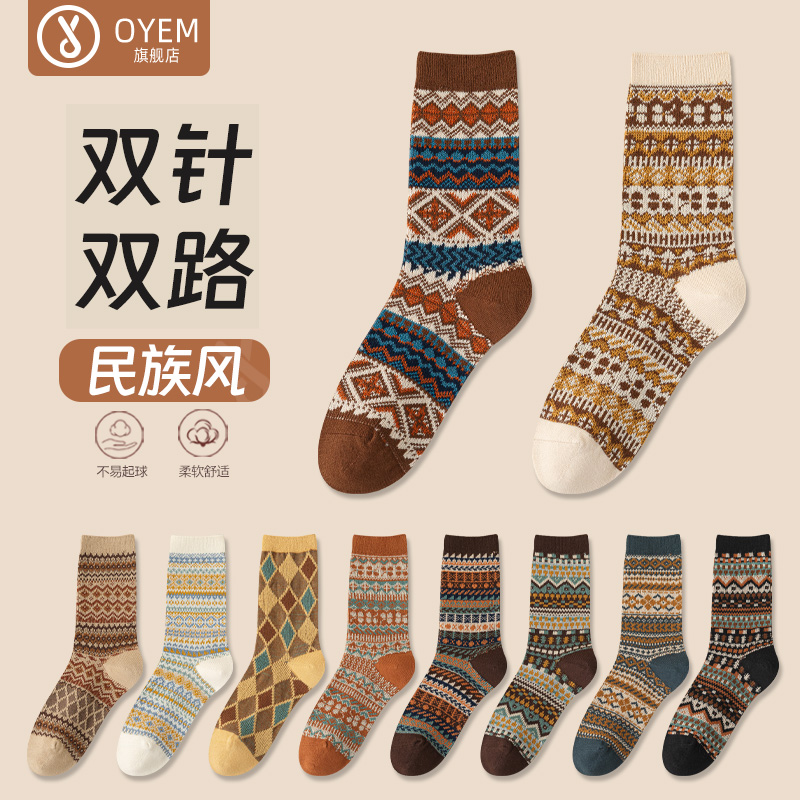 双针双路袜子女春秋款中筒袜复古民族风棉袜无骨堆堆袜冬季ins潮