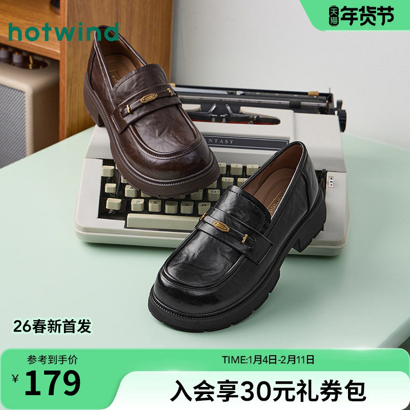 热风粗跟乐福鞋女鞋2026年春季新款通勤百搭黑色单鞋配裙子小皮鞋