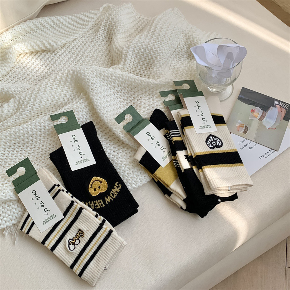 Onll To U指有你春秋款女士棉袜中筒袜卡通刺绣字母条纹个性潮袜