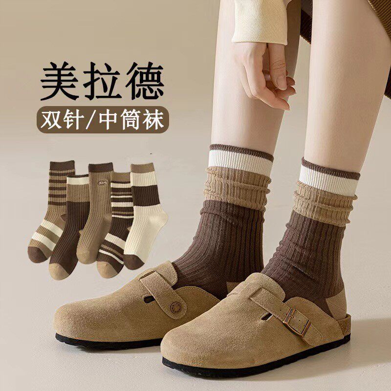 2026新品秋冬款美拉德个性潮袜子女中筒棕色复古条纹咖啡色经典