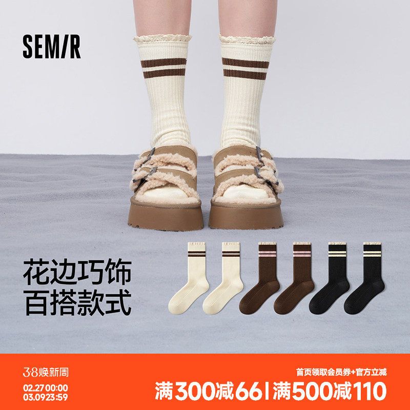 森马袜子女中筒秋冬季2026新款条纹日系个性潮袜含绵羊毛复古花边