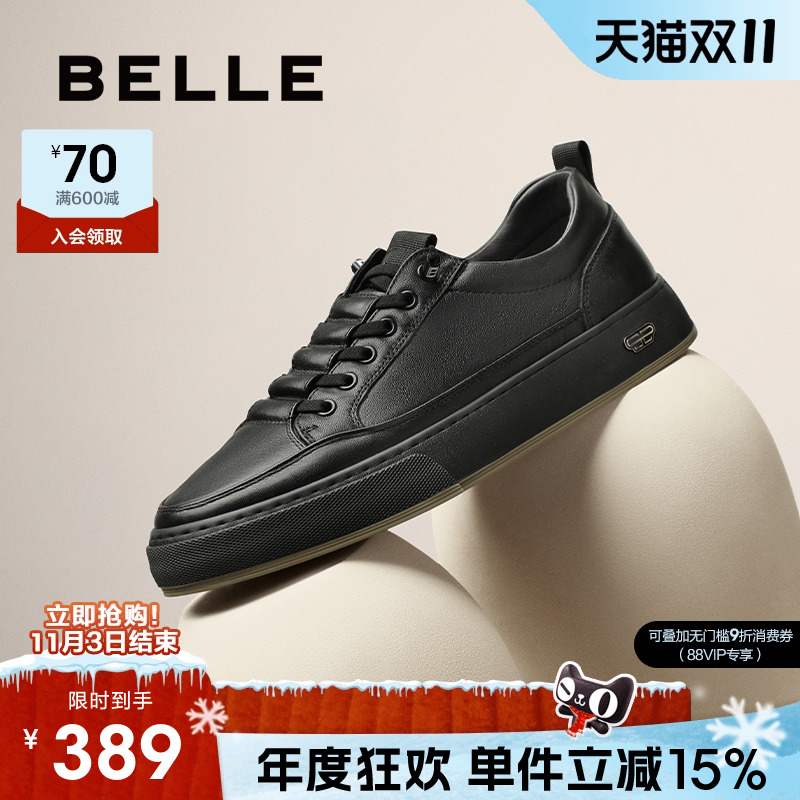 百丽男士厚底商务黑色板鞋冬季牛皮革休闲商务运动鞋加绒A1685DM4