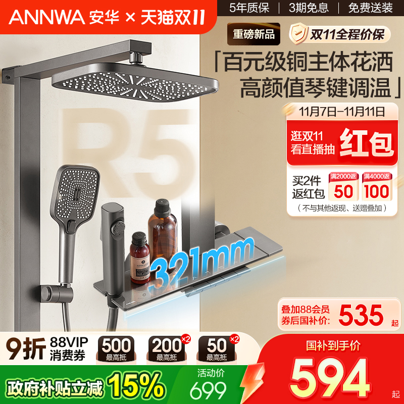 【政府补贴】安华卫浴淋浴花洒套装家用巨幕琴键喷枪59铜淋浴器R5