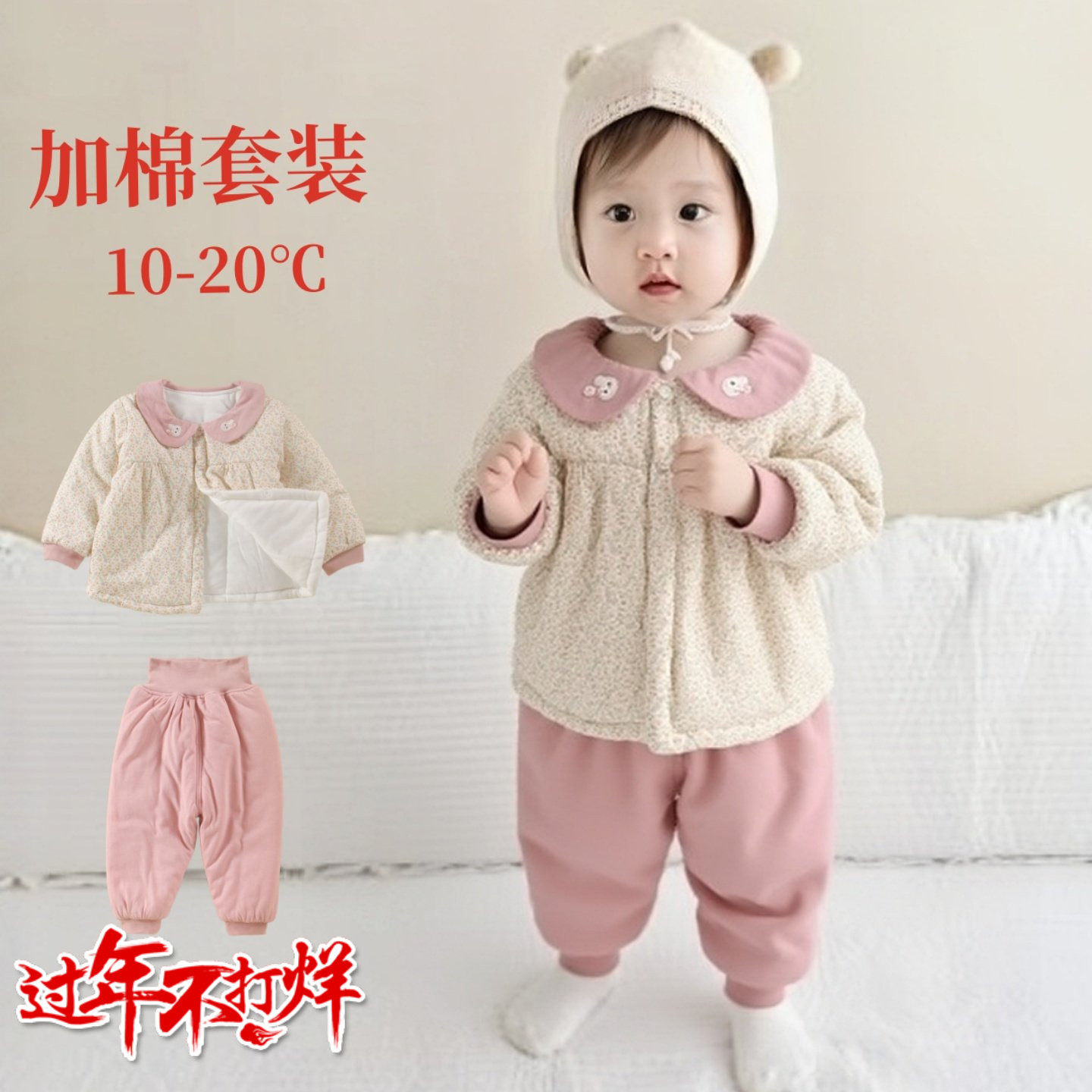 女宝宝秋冬夹棉套装0-1-2岁新生男婴幼儿薄棉外出服春加厚三件套