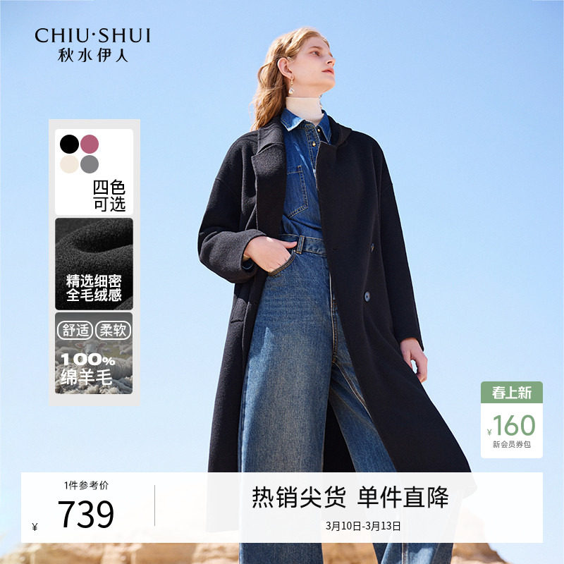 【100%绵羊毛】秋水伊人黑色长款双面毛呢大衣女2025冬季新款外套