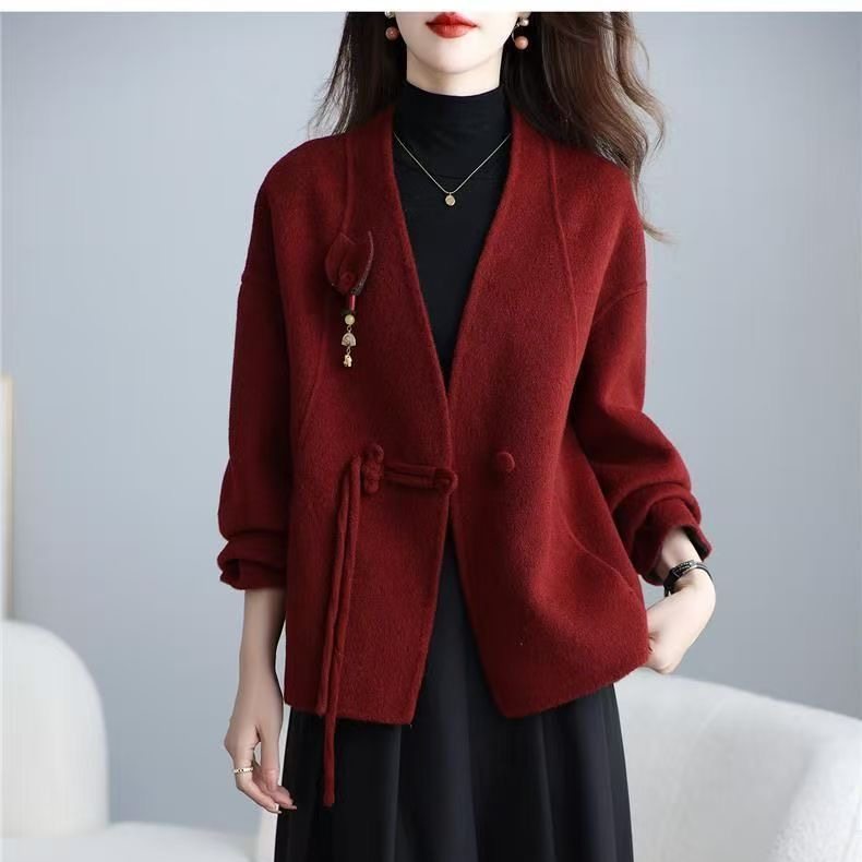 新中式国风宽松中年短款毛呢外套女25秋冬双面毛呢大衣红色小个子