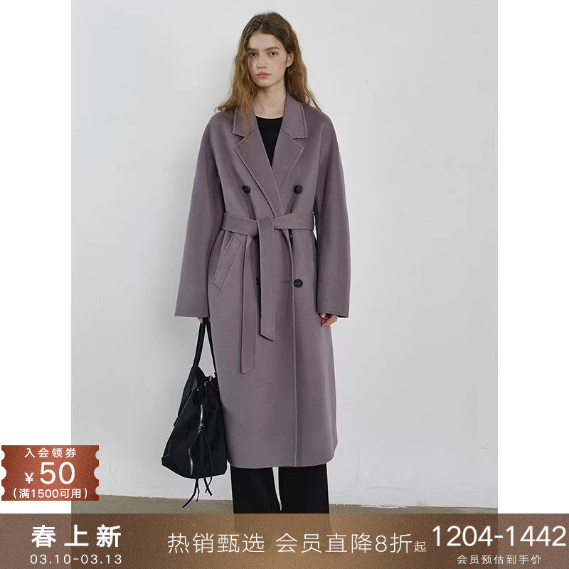 冬季新款重磅驼绒轻盈保暖简约系带大翻领羊毛双面毛呢大衣外套女