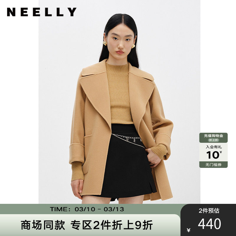 NEELLY纳俪商场同款冬新款双面毛呢大衣女大翻领收腰系带气质外套